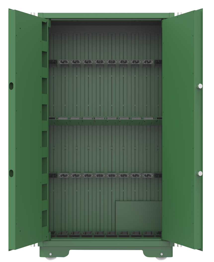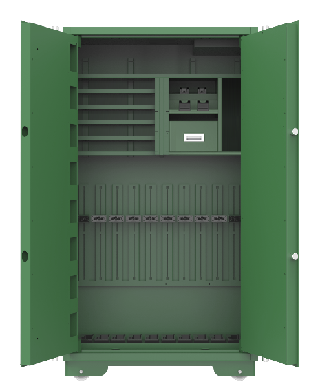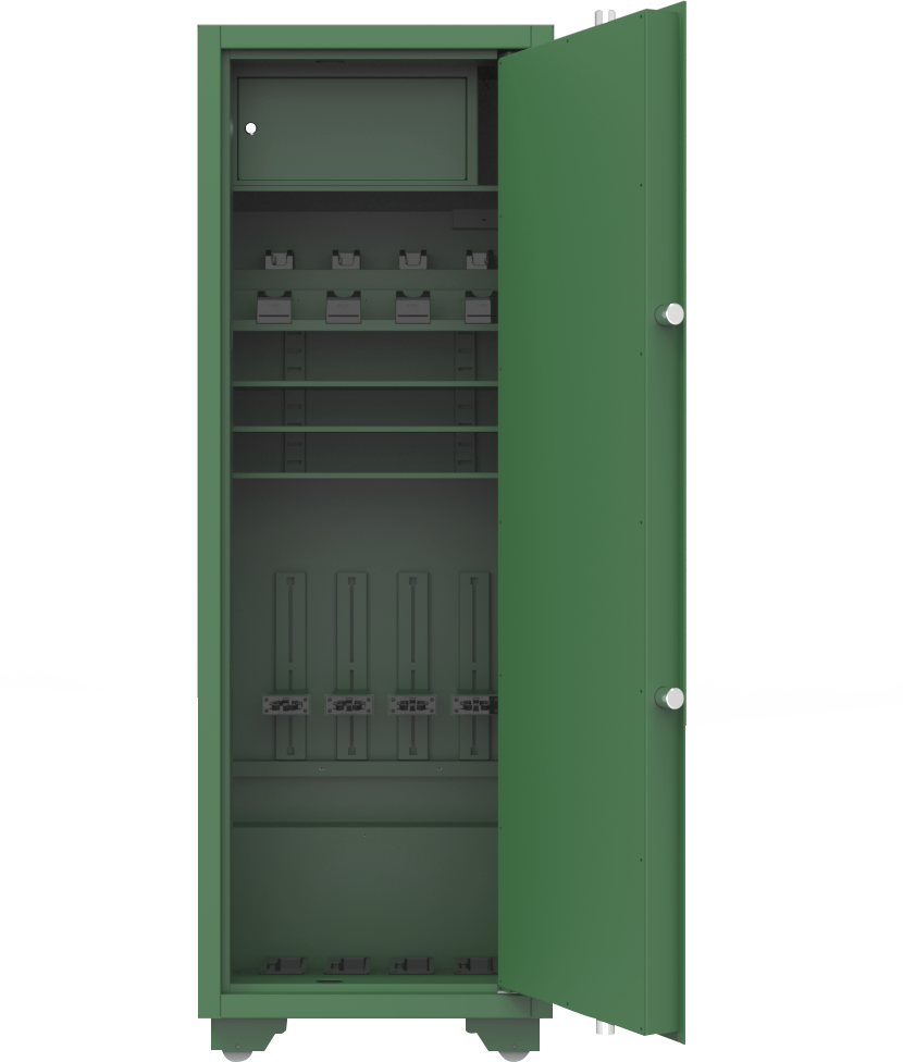 集成10寸嵌入式多功能控制器、枪支在位检测模块、智能门锁、智能弹仓锁、弹药检测计数模块等电子配件,应用物联网、生物识别、人工智能、实体防护等多种技术,实现枪弹的智能化日常管理工作。