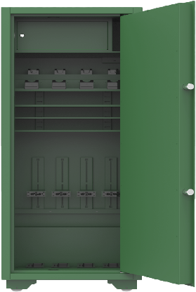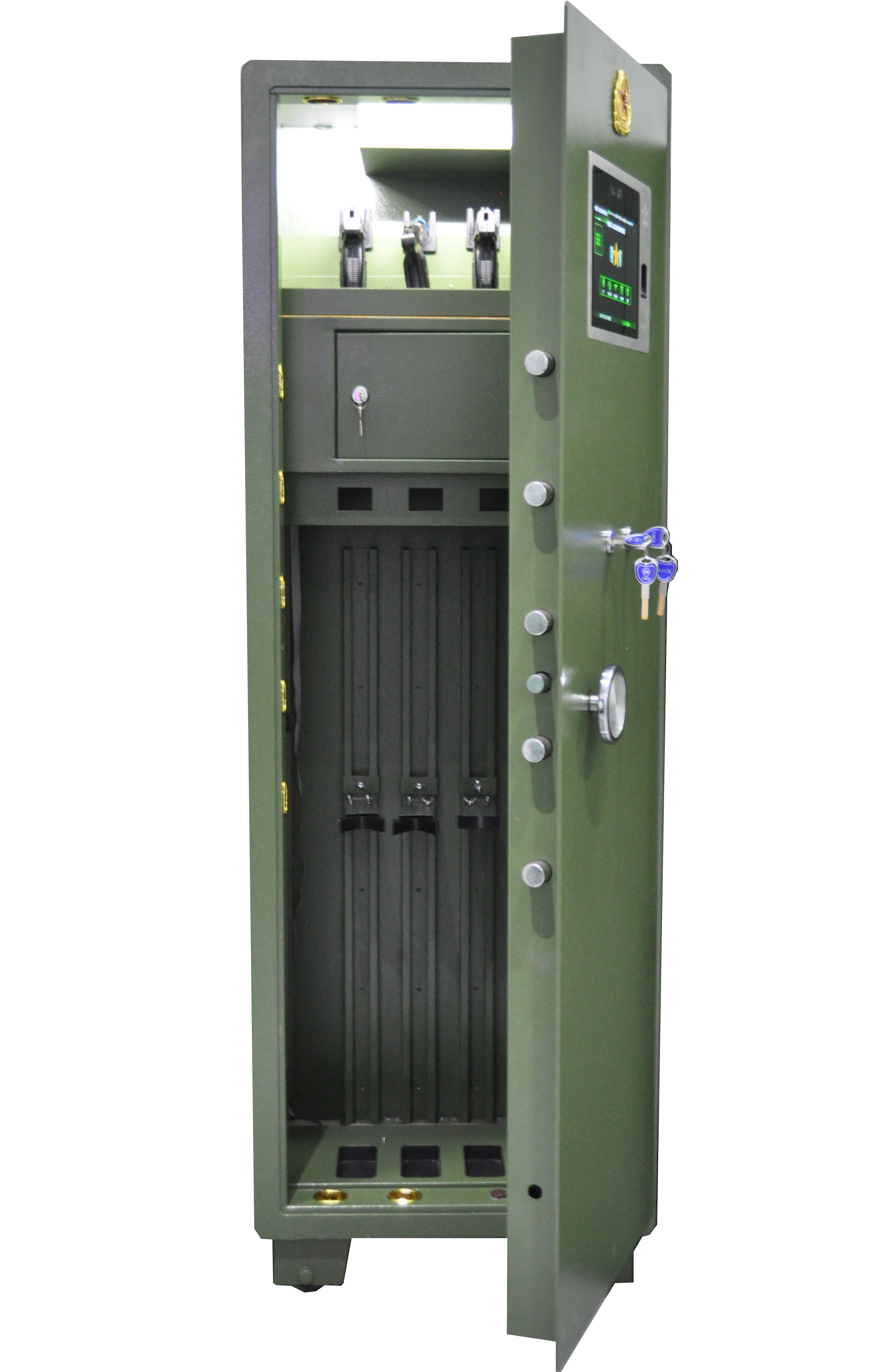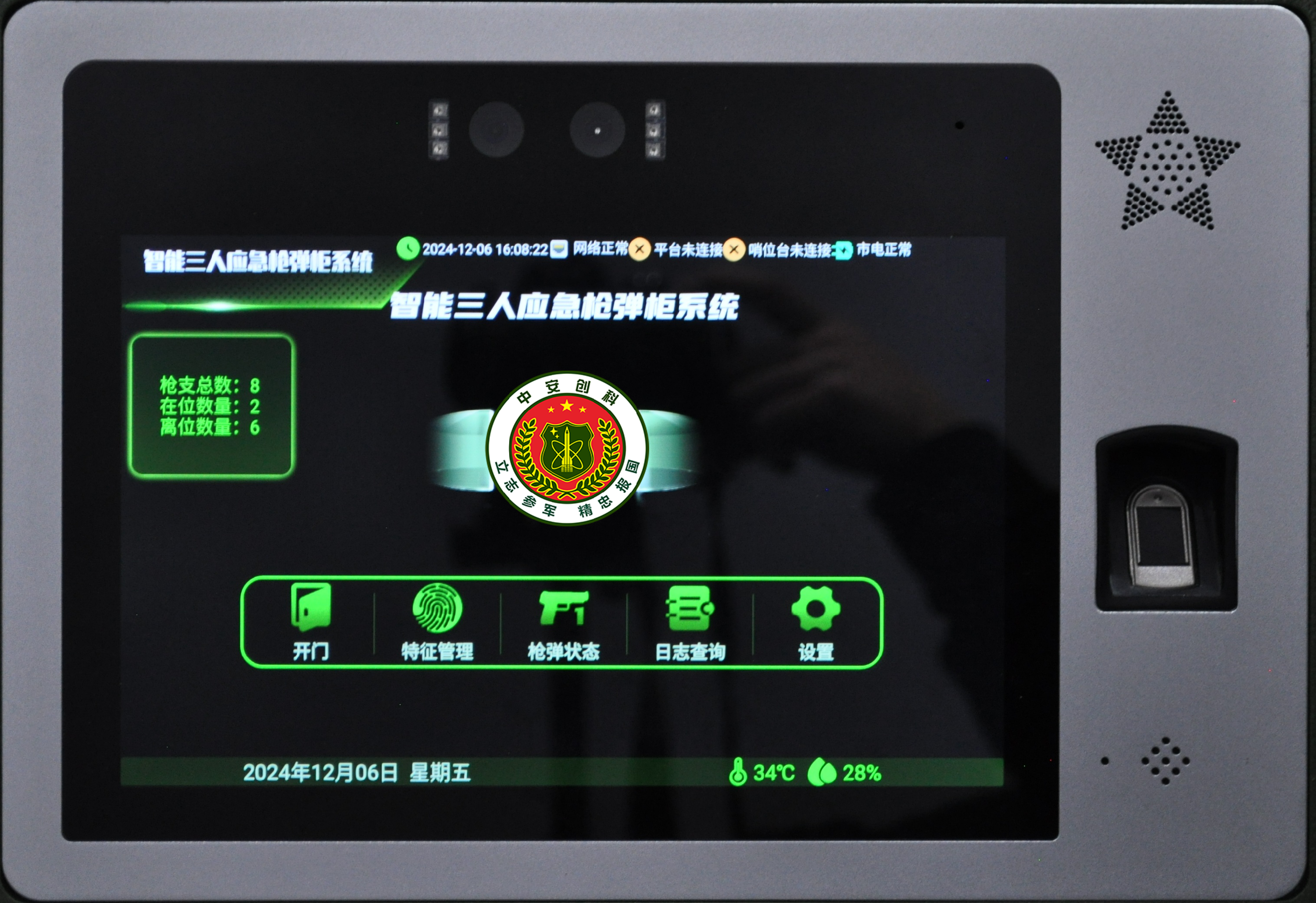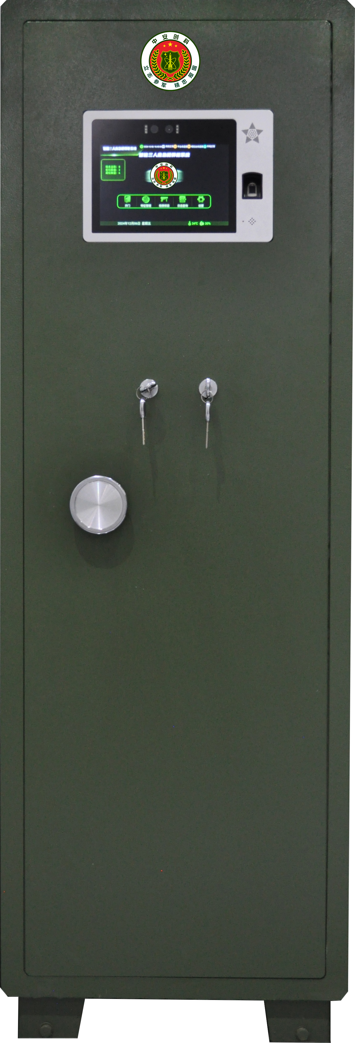 集成10寸嵌入式多功能控制器、枪支在位检测模块、智能门锁、智能弹仓锁、弹药检测计数模块等电子配件,应用物联网、生物识别、人工智能、实体防护等多种技术,实现枪弹的智能化日常管理工作。